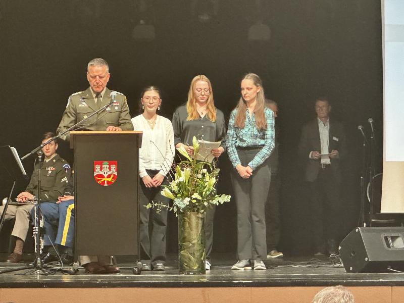 We are Laura Ellwanger, Polina Valeev and Lisa Shaffer. We attend the 12th grade advanced history class of the IGS Remagen. It is an honor for us to speak to you. As students of this history course, we often encounter historical events. Still, we have to acknowledge that as the fourth generation after the war the events of that faithful day in March 1945 resonate to this day.