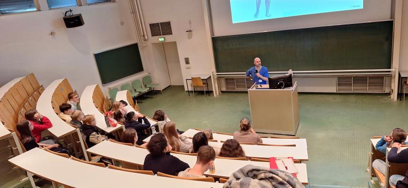 Nach dem Vortrag sind wir in die Uniklinik gegangen und wurden dort in zwei Gruppen aufgeteilt. Die Gruppen wurden immer von motivierten, freundlichen und geduldigen Studenten geleitet. Wir konnten abwechselnd einmal einen Simulator ausprobieren, der den Unterschied zwischen dem Atmen mit einer gesunden Lunge und dem Atmen mit einer Raucherlunge simulieren sollte. Die andere Gruppe konnte eine Pumpe ausprobieren, bei der man einen Mann durch Pumpen des Herzens zum Rennen bringen musste. Zurück im Hörsaal gab uns ein Kardiologe eine Vorlesung über das menschliche Herz-Kreislaufsystem. Dabei haben wir erfahren, wie der Blutfluss im Körper funktioniert und was das Herz dabei für eine Rolle spielt. Der Arzt hat auch noch etwas über die Arbeit eines Kardiologen berichtet.