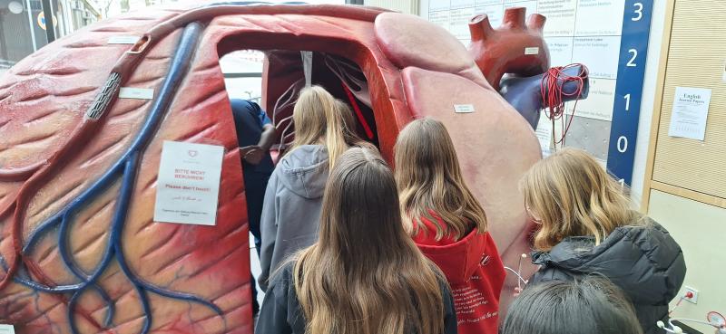 Im Anschluss konnten wir in Gruppen ein begehbares Herz erkunden. Dort wurde genau gezeigt, wie das Herz aufgebaut ist und wie es funktioniert. Die andere Gruppe konnte sich mit einem Stethoskop abhören. Als letztes gab es einen Vortrag über das Initiieren eines Rettungssanitäters. Dabei wurde erklärt, was man tun muss, wenn jemand einen Herzstillstand hat und wie das Reanimieren funktioniert. Die Klasse hat die Schritte "Prüfen, Rufen, Drücken" gelernt und selbst an Attrappen geübt. Durch unseren Aktionstag im Januar zum Thema “Gesunde Schule” war das schon die 2. Übung zur Wiederbelebung und der ein oder andere zeige sich schon als Rhythmusprofi.