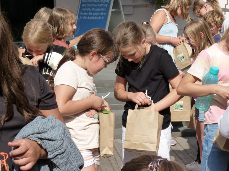 Ein paar Tage nach der Einschulungsfeier an unserer Schule wurden die neuen Schülerinnen und Schüler der Jahrgangsstufe 5 mit einer besonderen Überraschung begrüßt. Der Bürgermeister der Stadt Remagen, Björn Ingendahl, überreichte den aufgeregten Neuzugängen vor dem Rathaus Schultüten, die fair gehandelte und leckere Naschereien wie Schokolade und Chips beinhalteten. Darüber hinaus gab es auch viel Informatives rund um den fairen Handel.