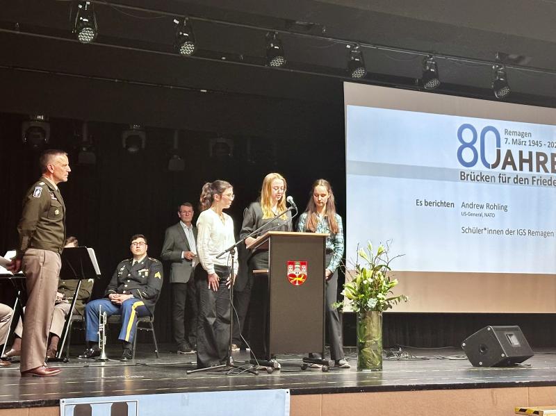 Wir sind Laura Ellwanger, Polina Valeev und Lisa Shaffer. Wir besuchen den Geschichtsleistungskurs der 12. Klasse an der IGS Remagen. Es ist uns eine Ehre, heute zu Ihnen sprechen zu dürfen. Als Schüler dieses Geschichtskurses begegnen wir oft historischen Ereignissen. Dennoch müssen wir anerkennen, dass die Ereignisse jenes schicksalhaften Tages im März 1945 auch für uns als vierte Generation nach dem Krieg bis heute nachhallen.