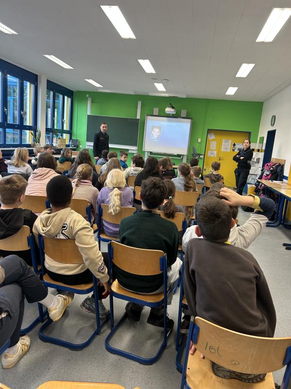 Im Anschluss waren zwei Polizeibeamte der Polizei Rheinland-Pfalz zu Gast und gestalteten eine spannende Präsentation. Sie berichteten eindrucksvoll aus ihrem Berufsalltag und erklärten, worauf man online achten sollte, wie man gefährliche Situationen erkennt und wo man Hilfe bekommt. Besonders schön war, dass die Kinder viele Fragen stellen konnten – und diese Möglichkeit auch intensiv nutzten. In kleinen Arbeitsphasen setzten sich die Klassen außerdem mit ihren eigenen Gefühlen rund um das Smartphone auseinander. Die Schülerinnen und Schüler sammelten Adjektive dazu, wie sie sich fühlen würden, wenn ihr Handy plötzlich kaputtgehen würde. Die Antworten reichten von traurig und wütend bis hin zu froh und erleichtert – ein spannender Austausch, der zeigte, wie unterschiedlich digitale Medien im Alltag erlebt werden.
