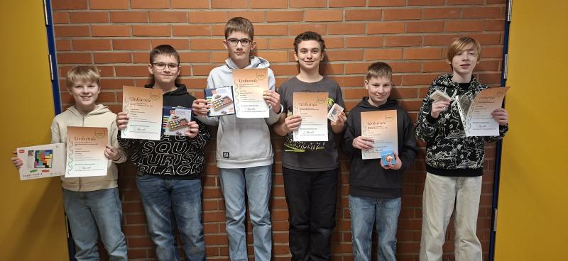 Alle Schülerinnen und Schüler freuten sich über eine Urkunde und kleine Teilnehmerpreise. Wie auch im letzten Jahr gab es für unsere Schule besondere Auszeichnungen. Als Schulsieger teilten sich den ersten Platz Enno Schmitz und Dominik Scholz. Den 2. Platz konnte Luca Rother für sich erobern. Den 3. Platz mit gleicher Punktzahl teilten sich Vincent Schwierz und Valentin Ghetea.